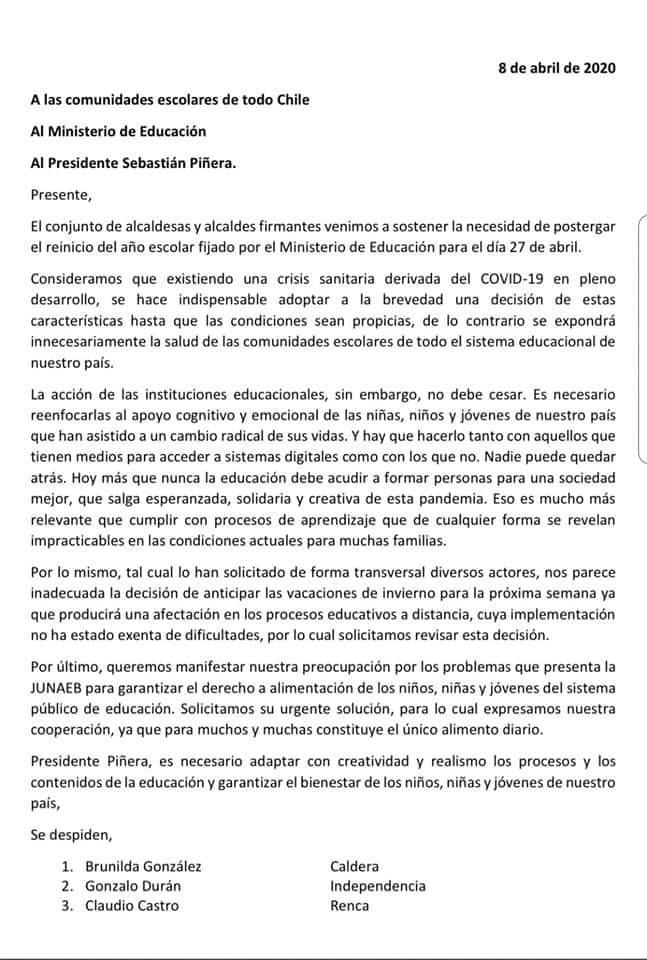 Los alcaldes de Porvenir Marisol Andrade, Patricio Fernández de Cabo de Hornos y de Primavera Bragomir Bristilo firman carta de numerosos ediles del país dirigida al Presidente de la República solicitando formalmente la suspensión del reinicio de clases programado por el Ministerio de Educación para el lunes 27 de abril proximo.