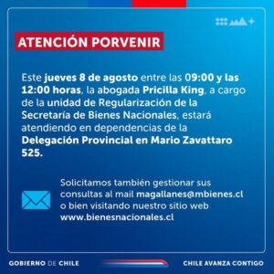 Este jueves 08 de agosto, ⏰️ entre las 09:00 y 12:00 horas, la abogada Pricilla King, a cargo de la Unidad de Regularización de la Seremi Bienes Nacionales Magallanes estará atendiendo a la ciudadanía para entregar orientación jurídica y acoger la postulación de nuevos casos en dependencias facilitadas por la Delegación Presidencial Provincial en📍Mario Zavattaro 525, Porvenir.